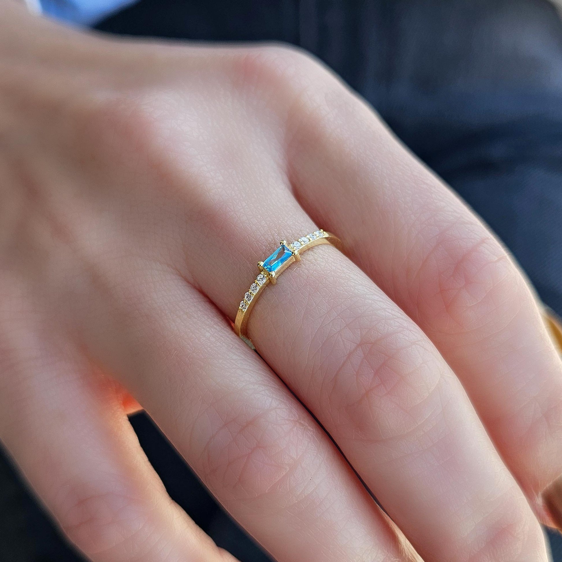 10K Gold Minimalist Baguette Sky Blue and Cz Ring - 2S2SKY