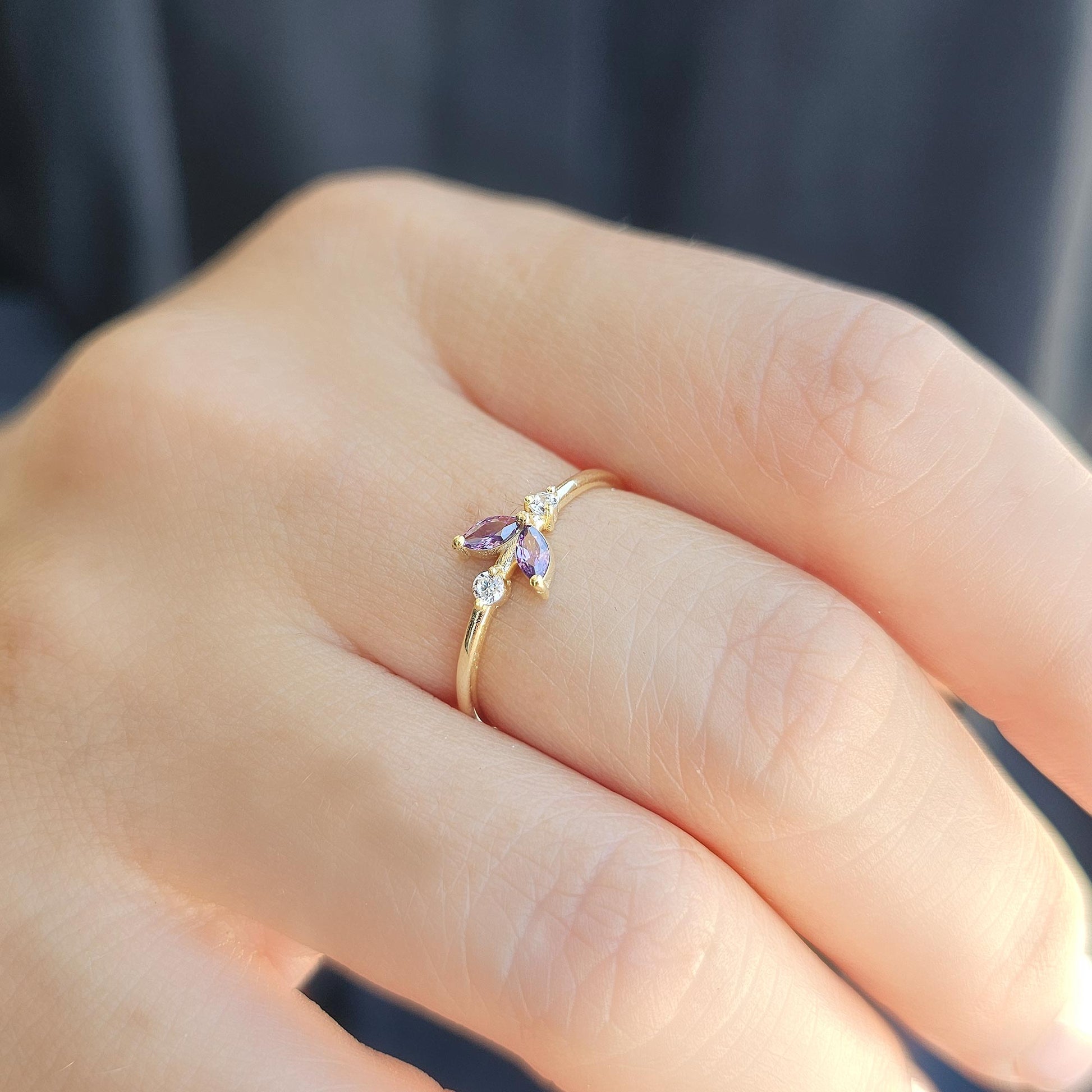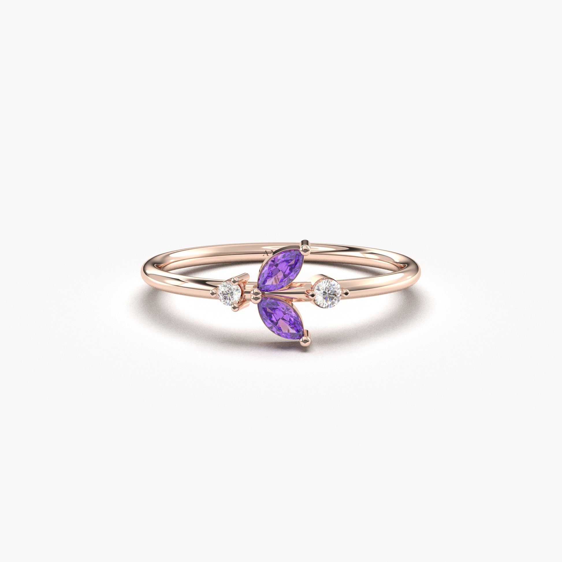 14K Gold Dainty Marquise Amethyst and Diamond Ring - 8S8AME